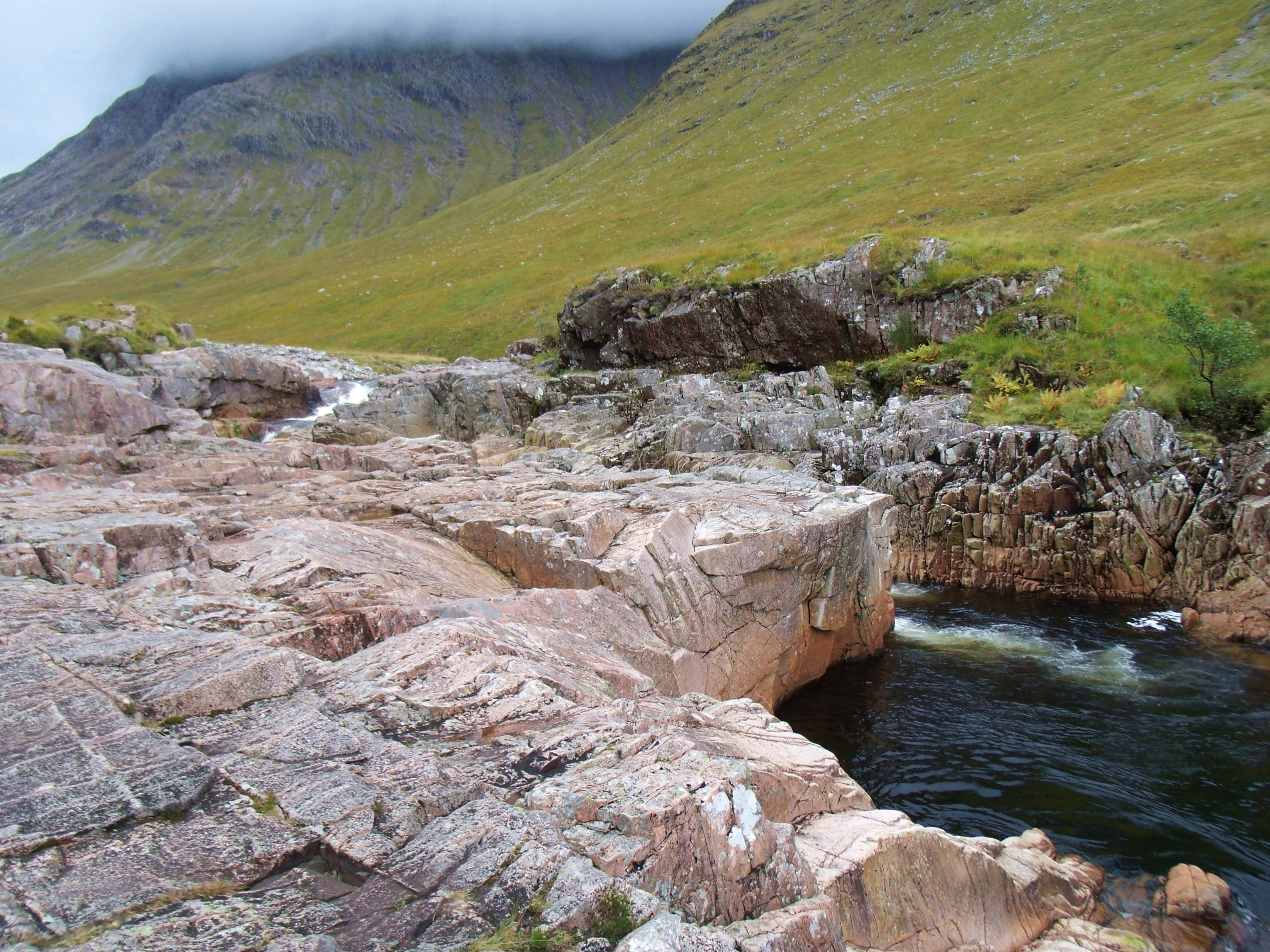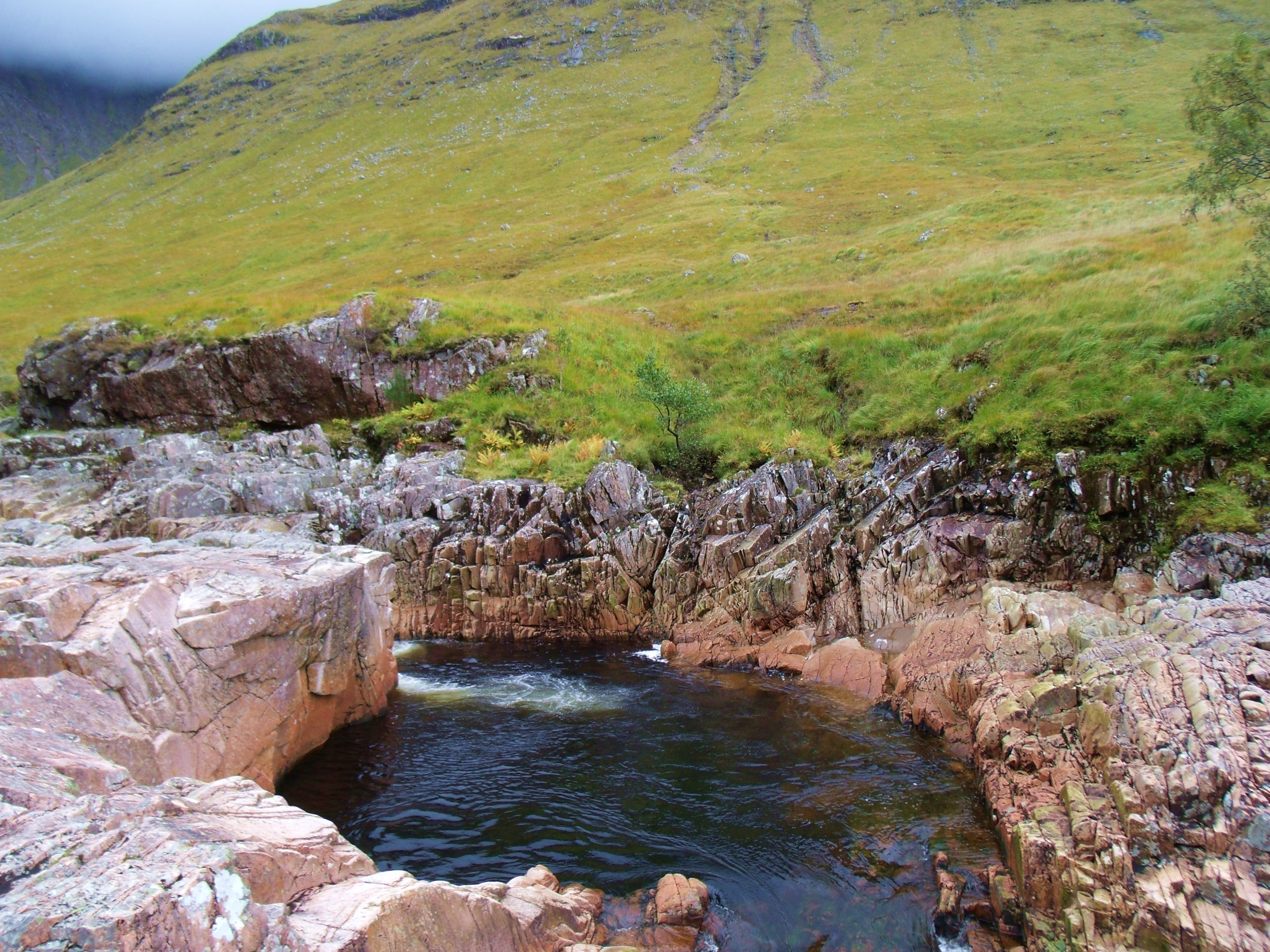 Before setting out for a hike north on the West Highland Way, I took the time to check out a beauty spot litttle known outside the local area. Beer Bottle Pool in the River Etive, lies along the road leading to Glen Etive. It is hidden from the road. Its distinctive geological formations make it a must see.