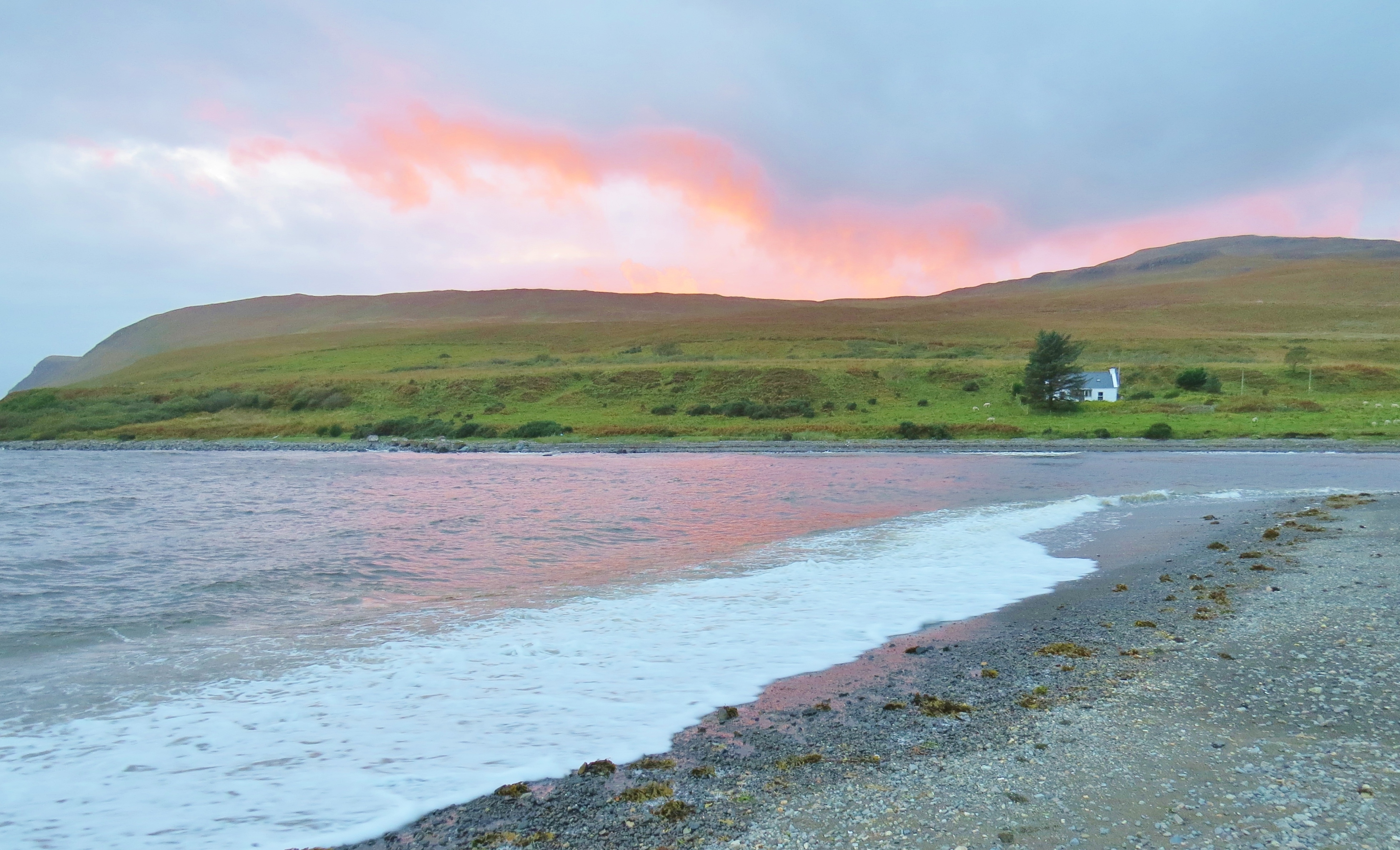 At the South of the island, Brittle Beach, pictured below, lies on the edge of Glen Brittle, an area of gently rolling hills, moorland and pasture in the shadow of the Black Cuillin, a rugged mountain range that rises straight out of the Cuillin Sound, in the Atlantic Ocean.