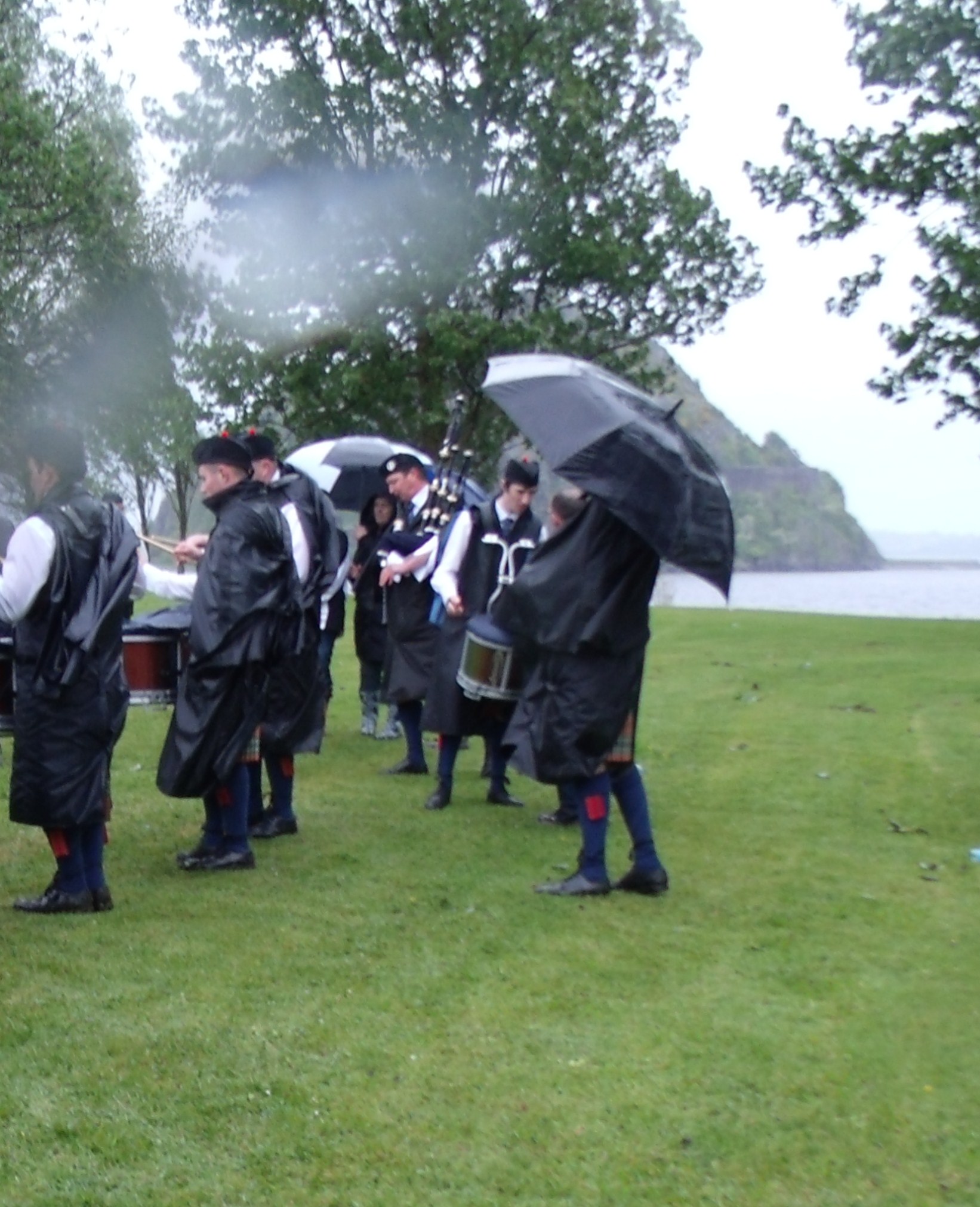 This year, 2011, was a different matter. High winds and torrential rain, with us for almost all of the month of May, made for a very different experience for both band members and specators. Below is a telling photo and a video that lets us hear the excellent playing of the Central Scotland Police Band, weather notwithstanding. The festive air of the occasion comes accross also.